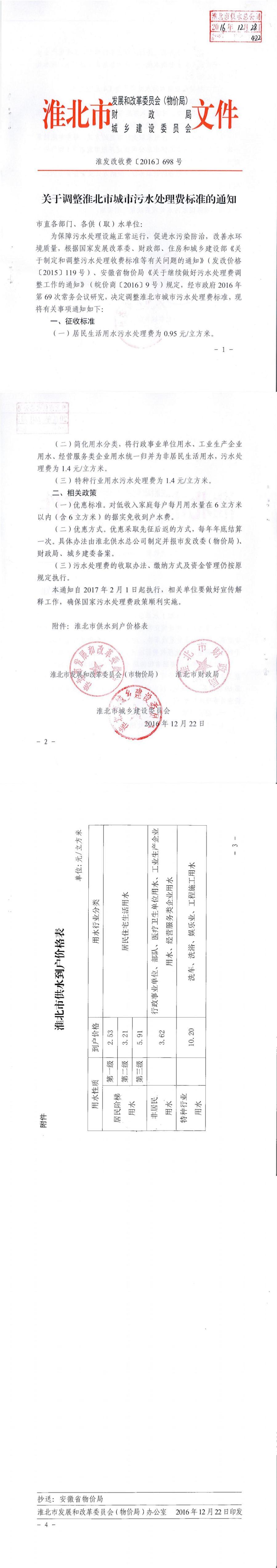 關(guān)于調(diào)整淮北市城市污水處理費(fèi)標(biāo)準(zhǔn)的通知 淮發(fā)改收費(fèi)【2016】698號