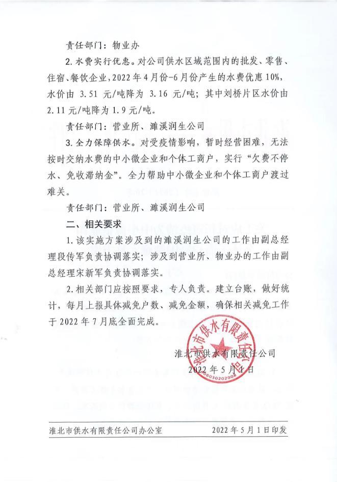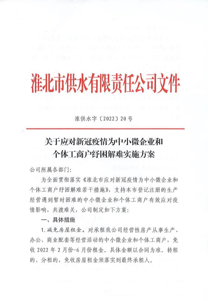 淮北市供水有限責(zé)任公司關(guān)于應(yīng)對(duì)新冠疫情為中小微企業(yè)和個(gè)體工商戶紓困解難實(shí)施方案 淮供水字【2022】20號(hào)