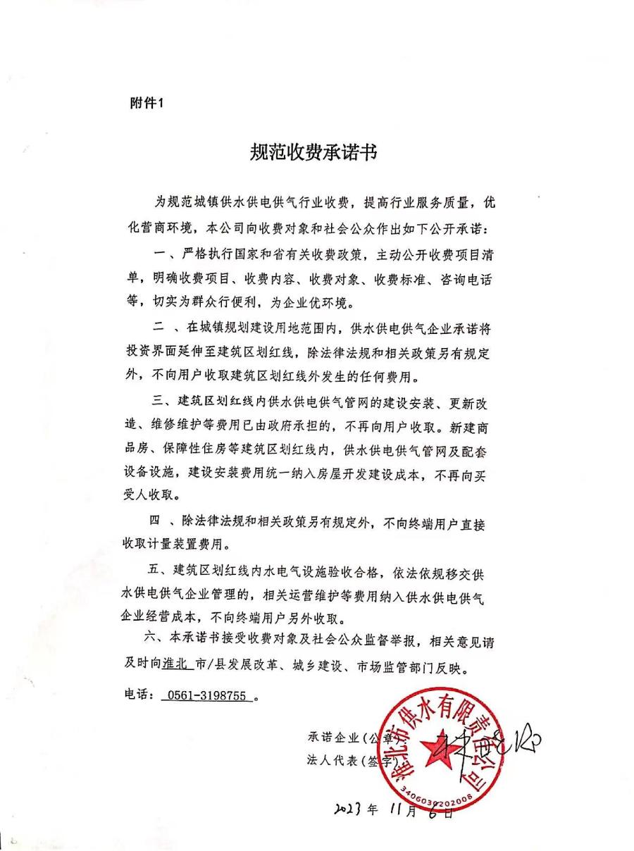 淮北市供水有限責(zé)任公司規(guī)范收費(fèi)承諾書