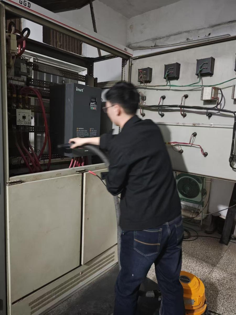 經(jīng)過仔細(xì)檢測(cè),維修人員精準(zhǔn)定位問題:變頻器內(nèi)部灰塵堆積,散熱過慢,導(dǎo)致過熱停機(jī),遠(yuǎn)程控制設(shè)備電源故障。面對(duì)復(fù)雜的故障,他們分工明確,一組負(fù)責(zé)維修變頻器,小心翼翼清理灰塵;另一組全力搶修遠(yuǎn)程控制設(shè)備,仔細(xì)排查、重新接線更換電源。